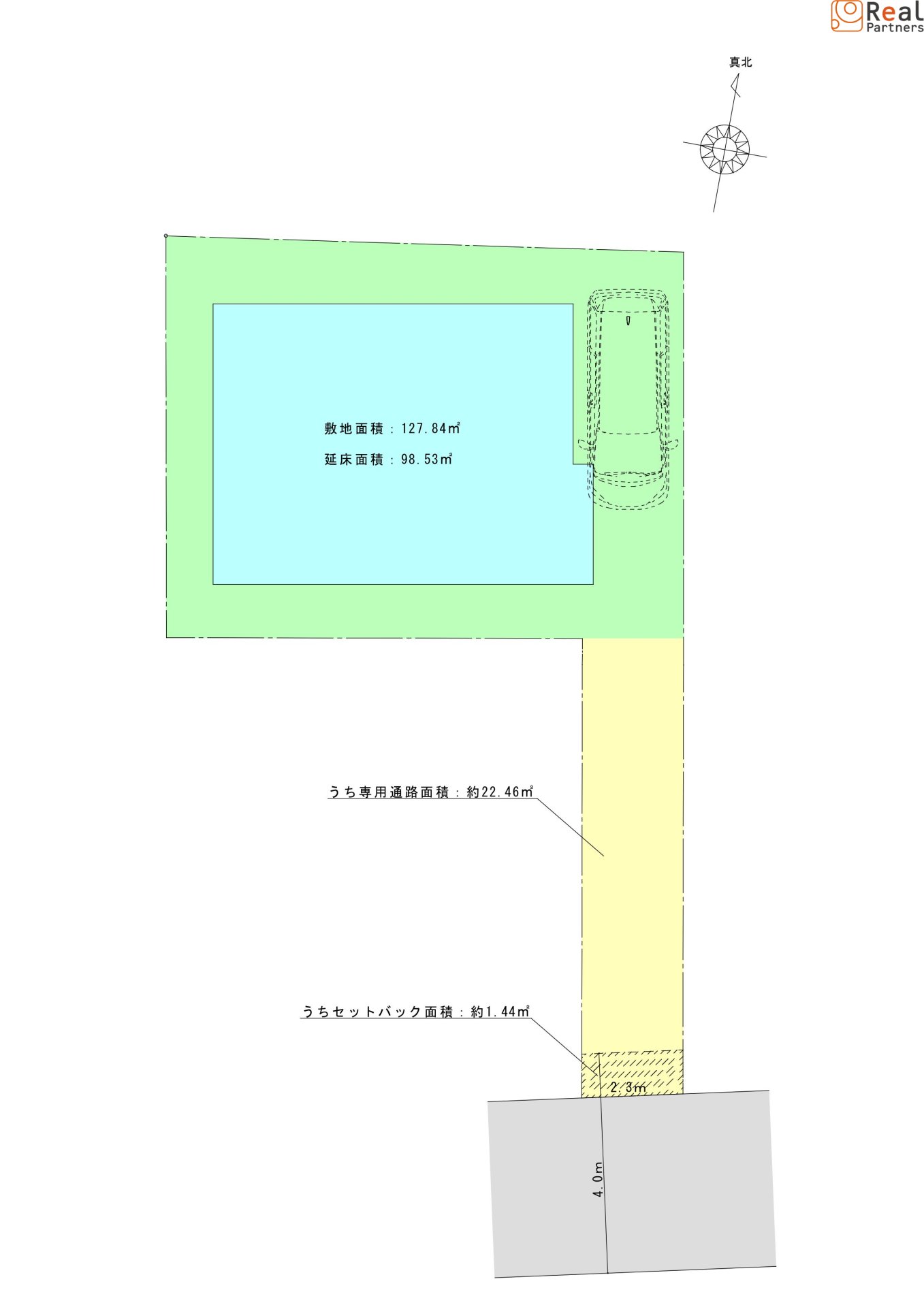 | 面積(平米) | 土地:129.28 建物:98.53 | 建蔽/容積率 | 建ぺい率:40% 容積率:80% |